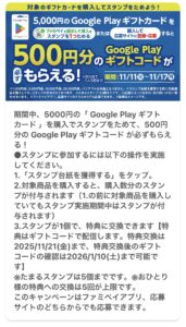 2025/11/11から2025/11/17の期間中にファミリーマートで5,000円のGoogle Playギフトカードを購入すると、500円分のGoogle Playギフトコードがもらえるキャンペーンを実施中です。